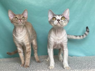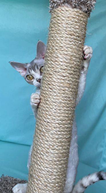 Karmacatz BeeGee of Fernweh, chocolate silver patched mackerel tabby Devon Rex