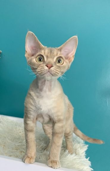 GC, BWR, NW, AGN Fernweh After the Storm (Iris), Chocolate patched mackerel tabby and white Devon Rex