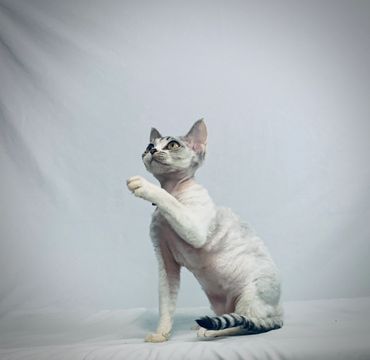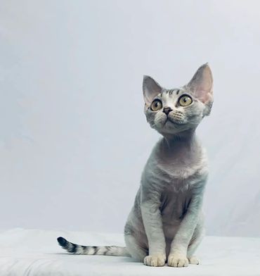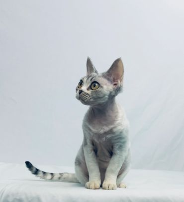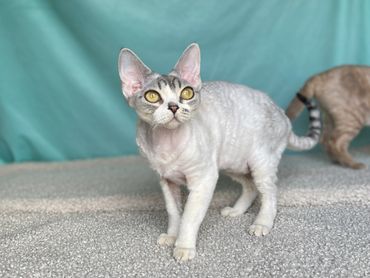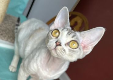 GC, RW Karmacatz Sugar Bee of Fernweh (Sugar), silver patched mackerel tabby and white Devon Rex